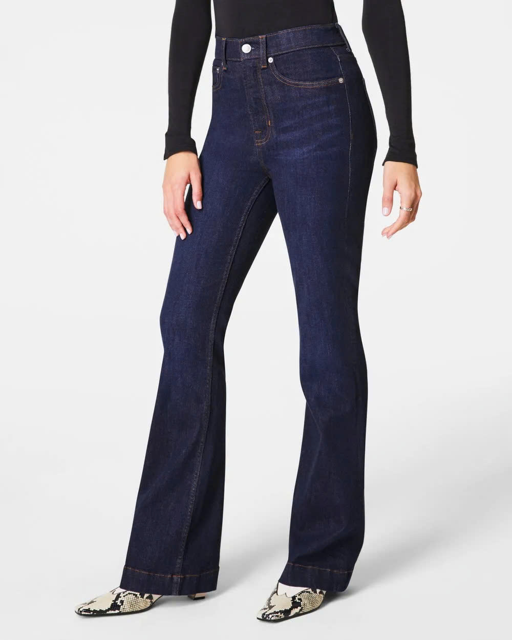 Upgrade your wardrobe with these ultra-soft, high-stretch flare jeans that sculpt, smooth, and flatter every body shape. Made from premium denim that feels as cozy as leggings, they mold to your curves while maintaining their shape all day long. Featuring a true 5-pocket design, working zipper and button closure, and targeted sculpting zones, these jeans deliver unmatched compression and a beautifully defined silhouette. The high-rise fit offers excellent tummy control, giving you a slimmer waist and accentuated curves. Universally flattering and effortlessly stylish, these flare jeans are the perfect blend of comfort, lift, and confidence—available in petite, regular, and tall inseams.