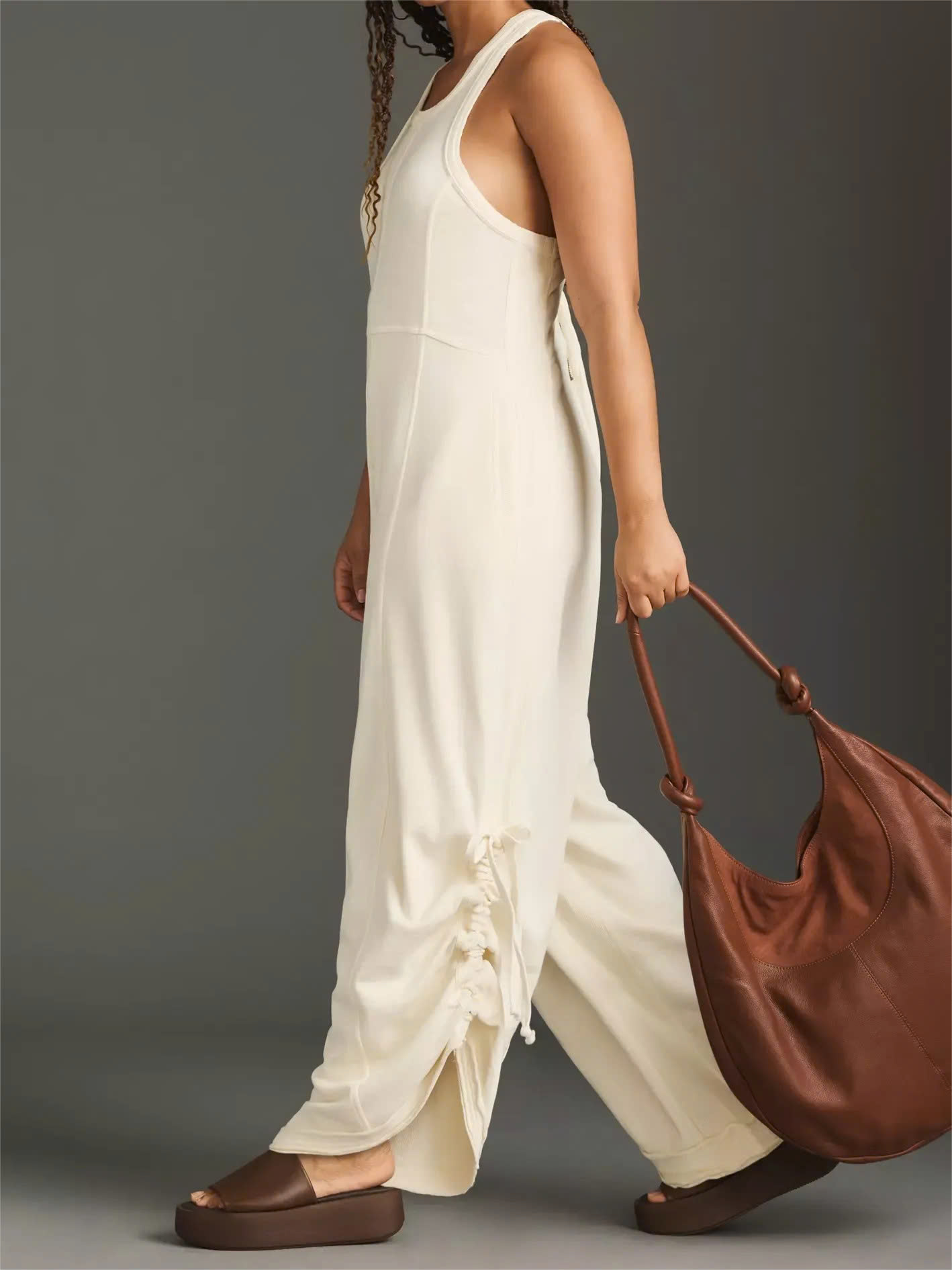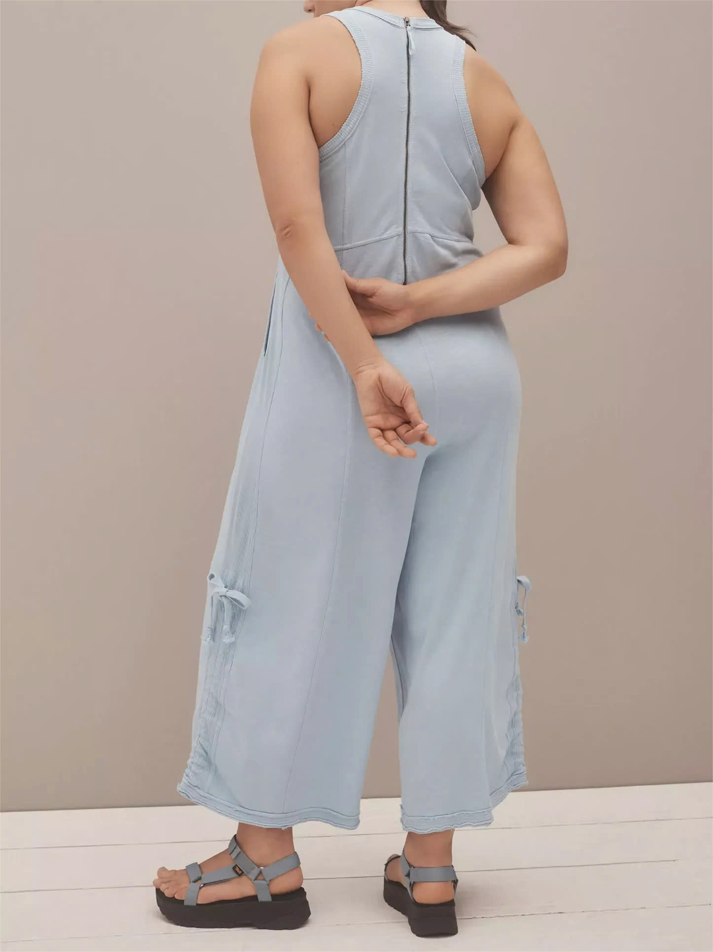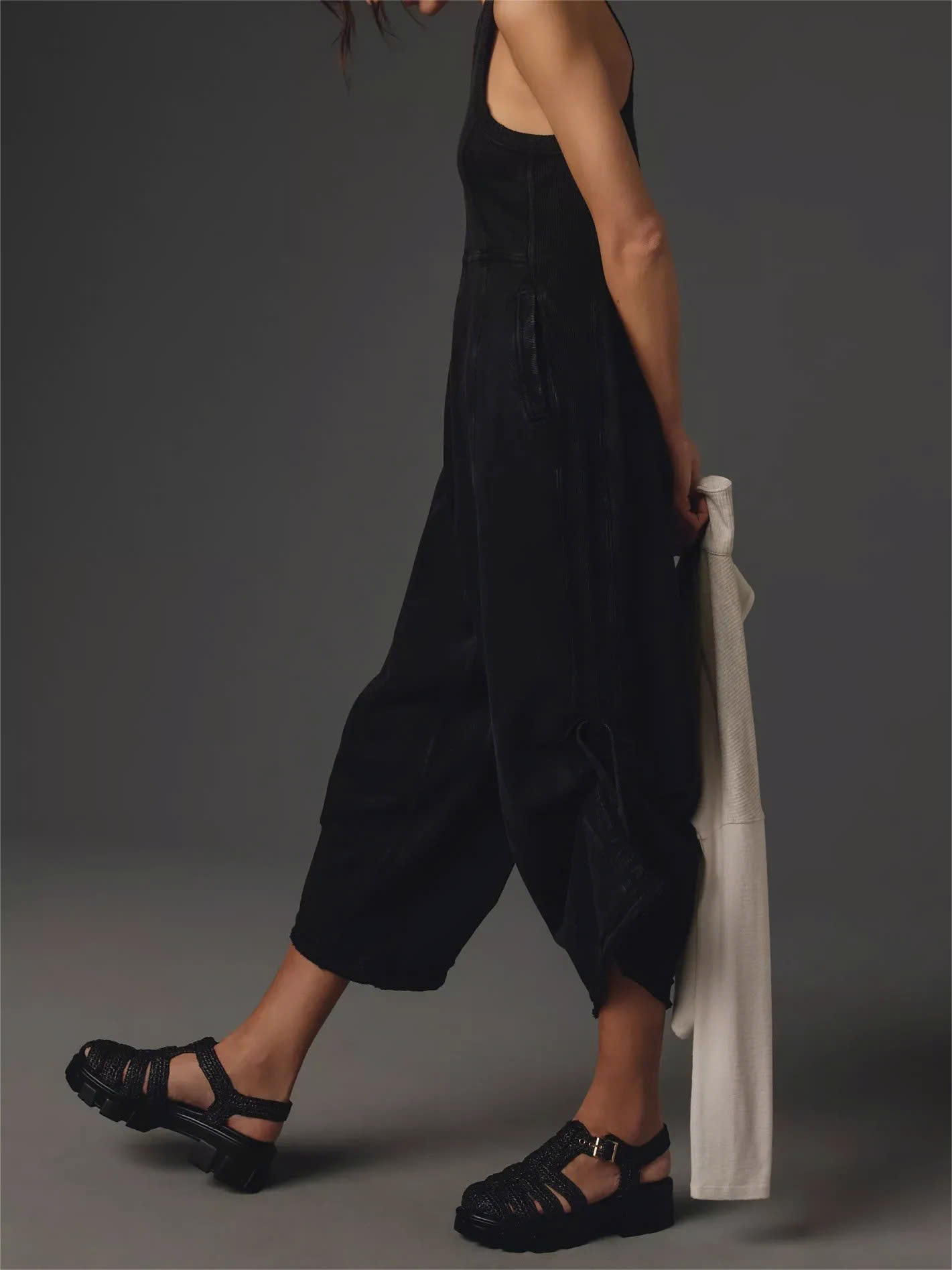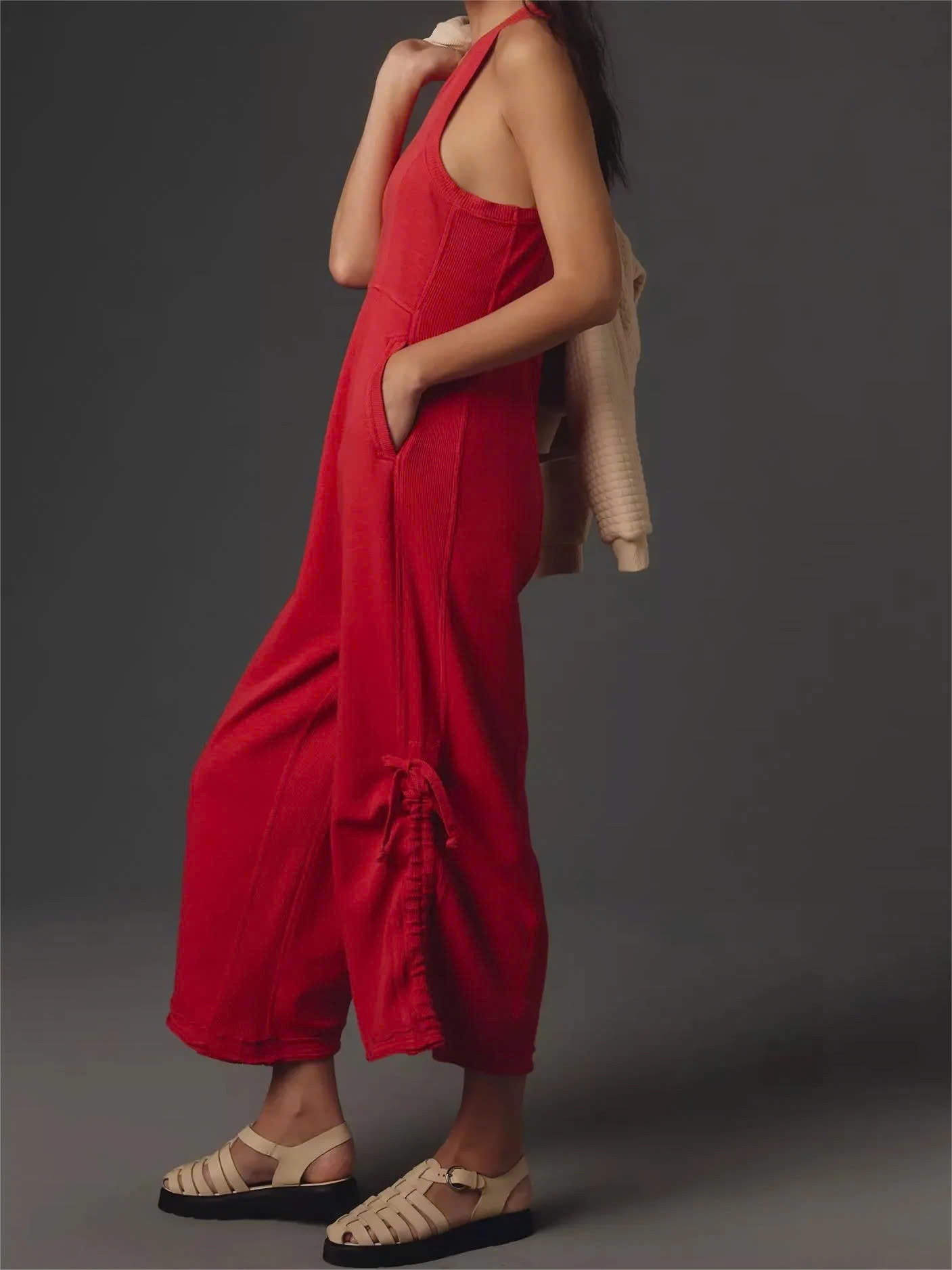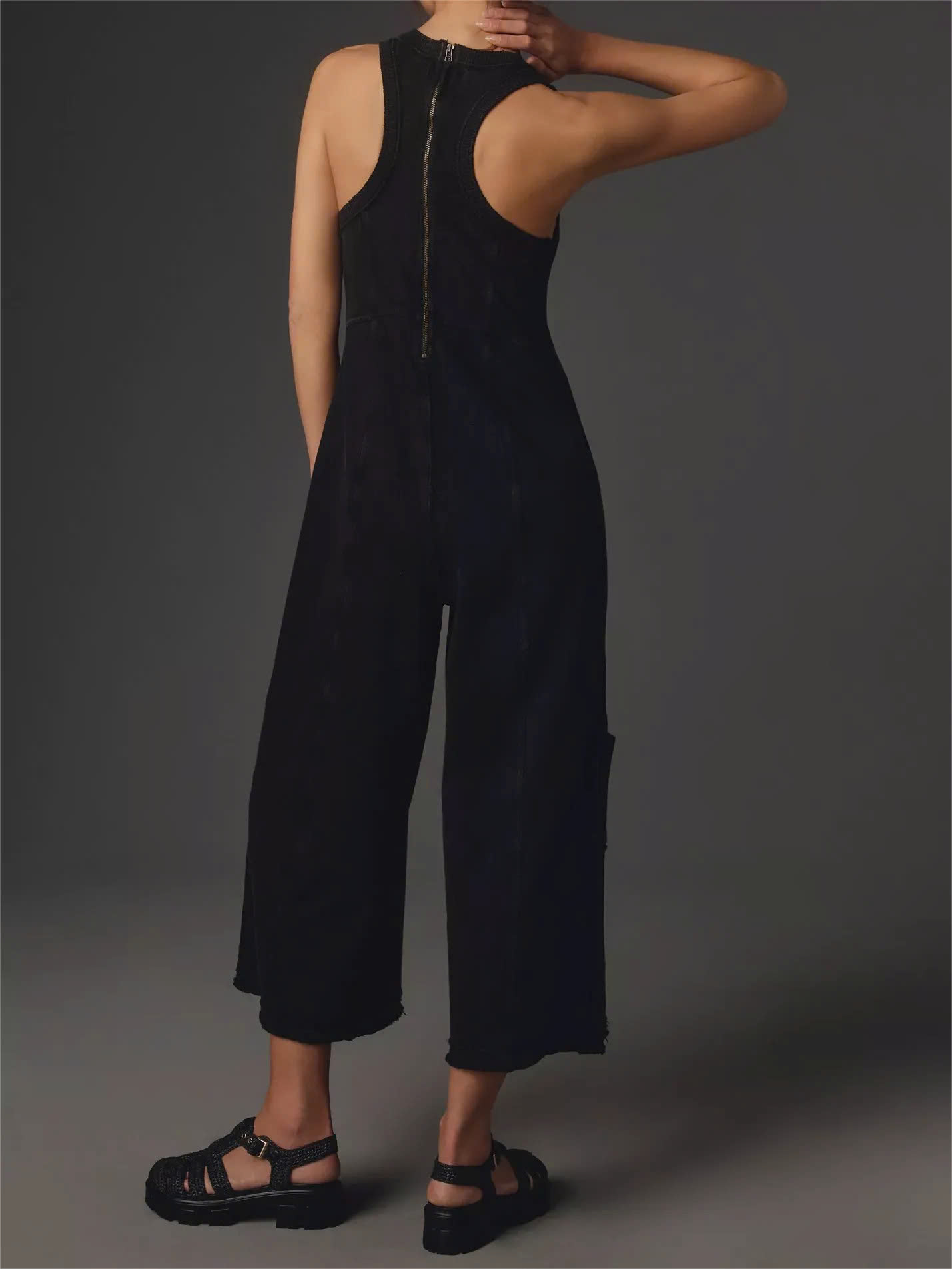 Seamed Detailing: Strategically placed seams create a structured yet flowing aesthetic, enhancing the overall drape of the jumpsuit.