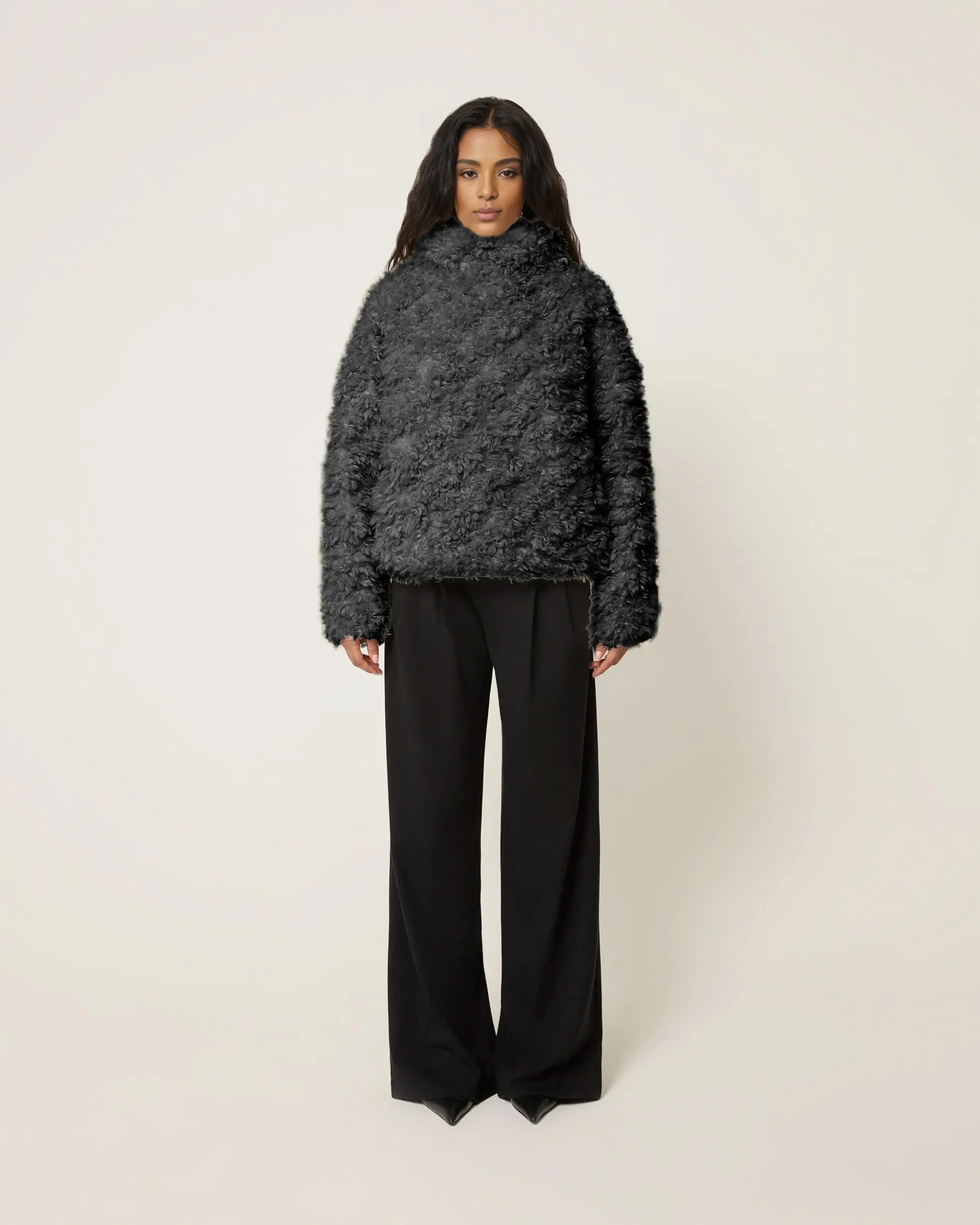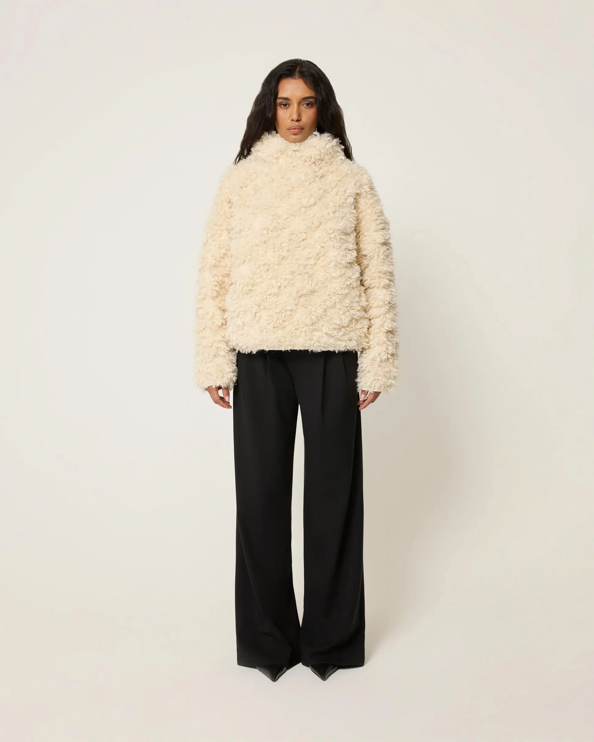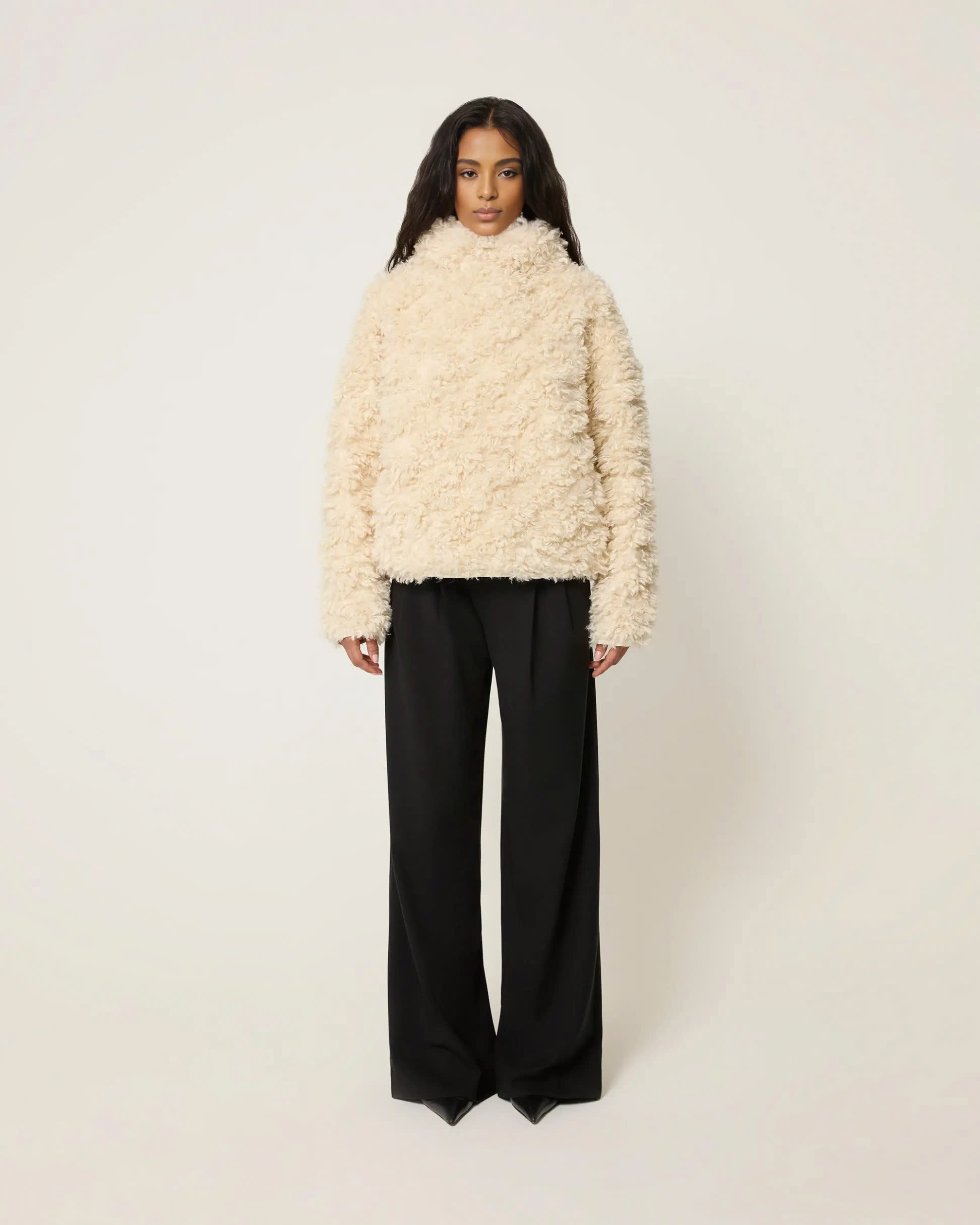Our pullover is carefully crafted with high-quality faux lambswool material, each fleece is delicate and soft, as if it were a cloud brushing against your skin.