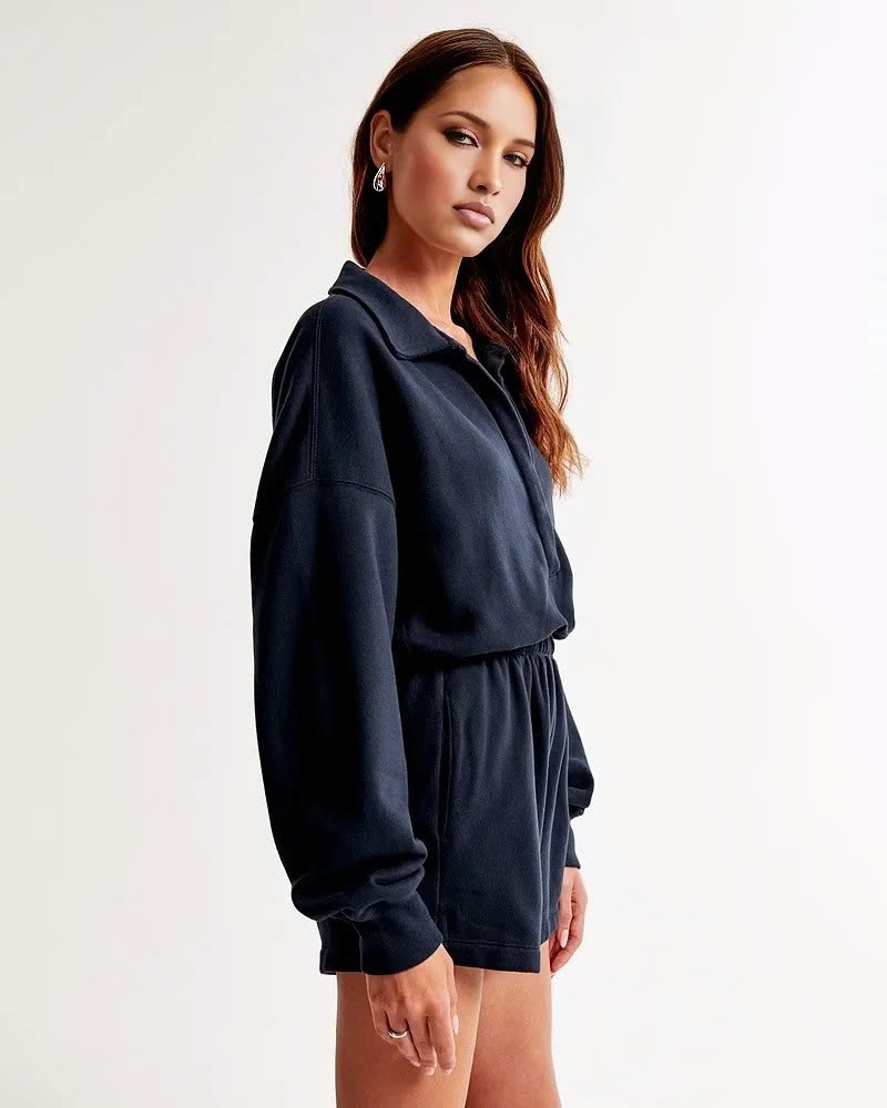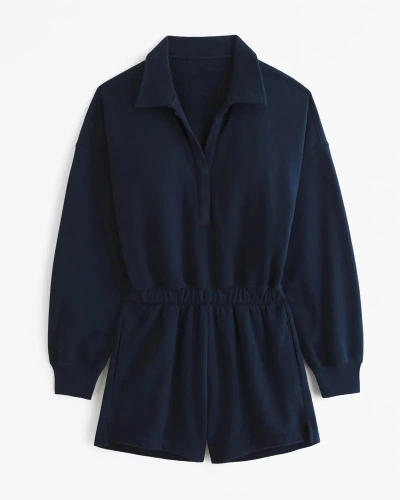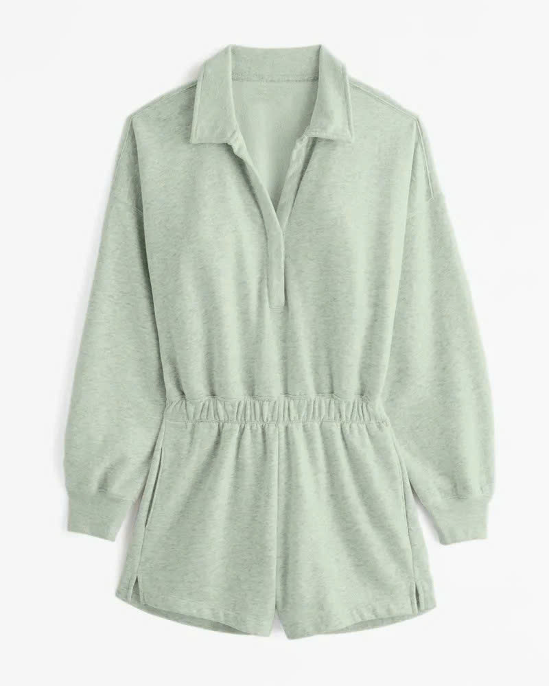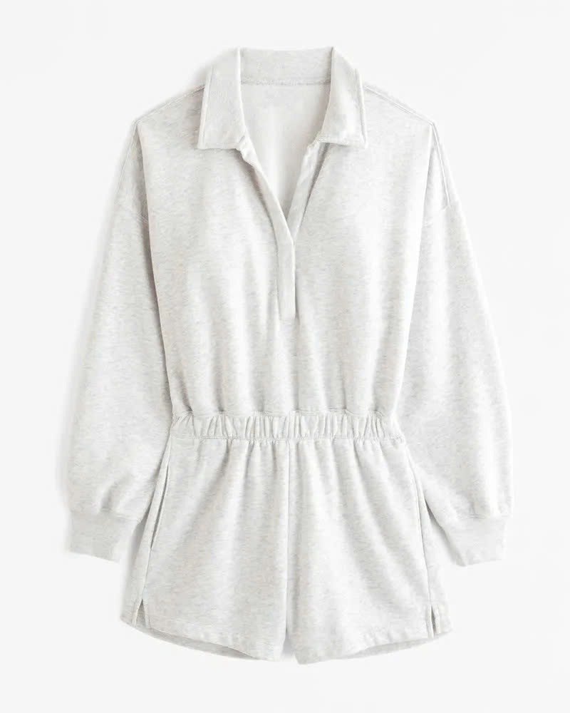 Comfortable long-sleeve romper in our soft fleece fabric, featuring a classic collar, elasticated waistband, pockets and v-neckline. Imported.