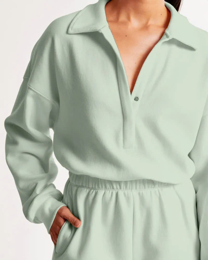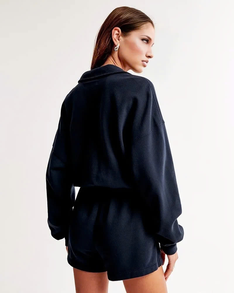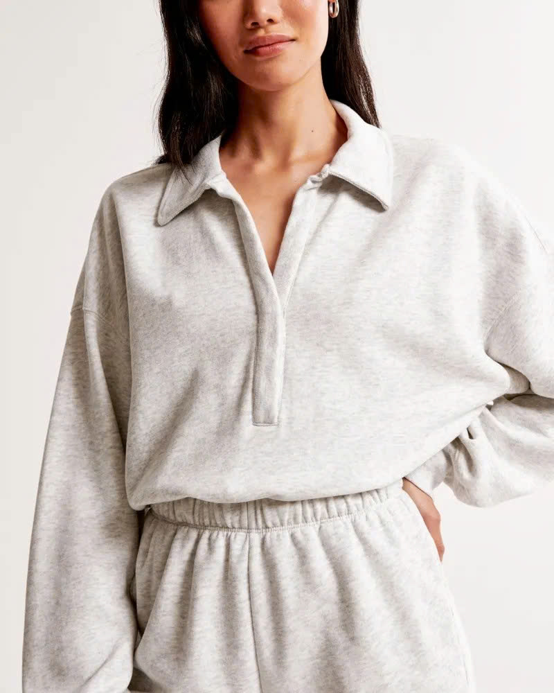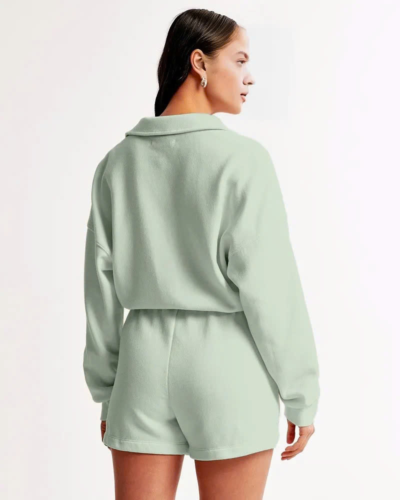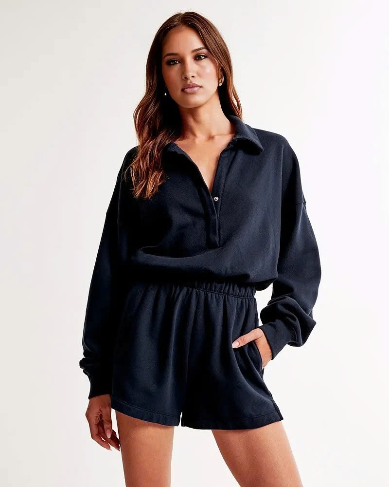 Comfortable long-sleeve romper in our soft fleece fabric, featuring a classic collar, elasticated waistband, pockets and v-neckline. Imported.