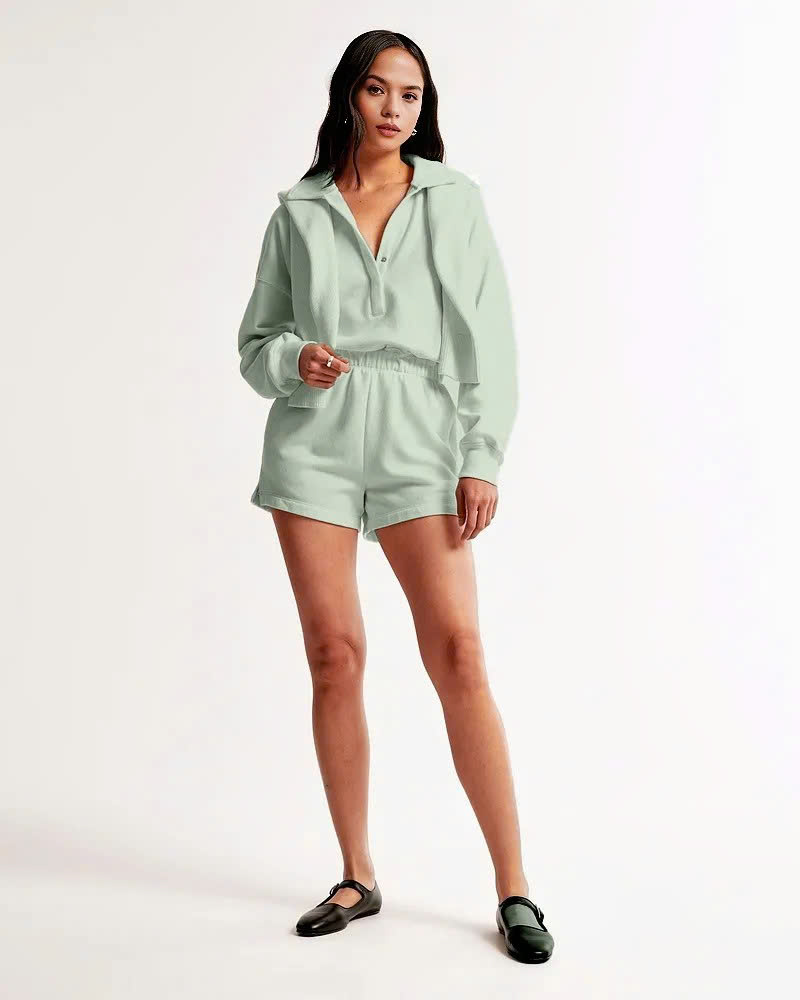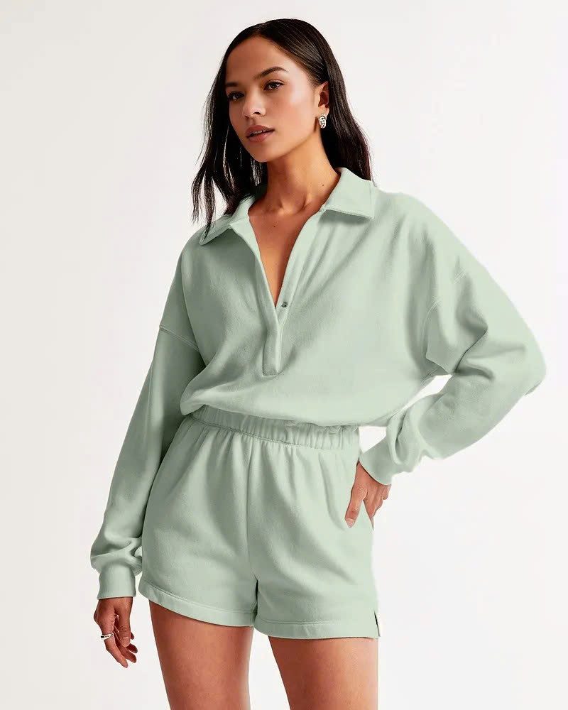 Features a classic polo collar, an elasticated waistband and pockets. Imported.