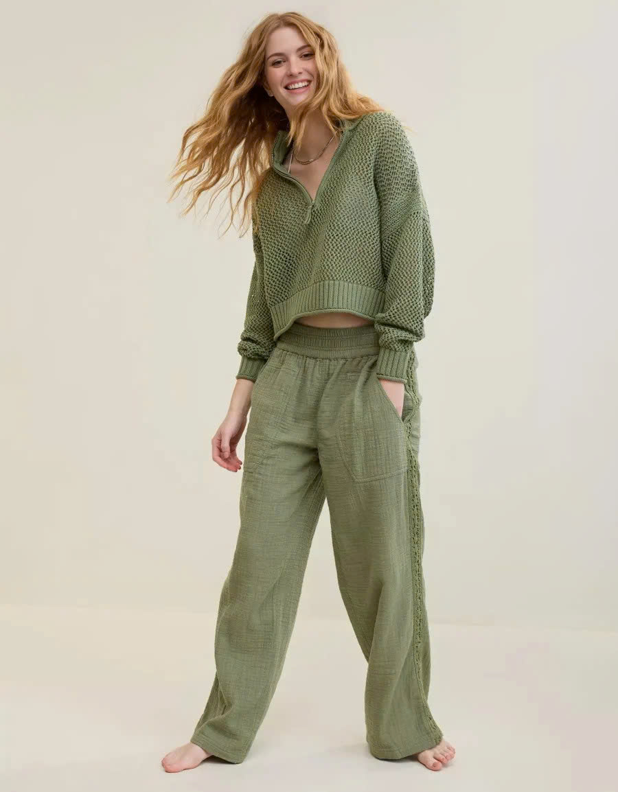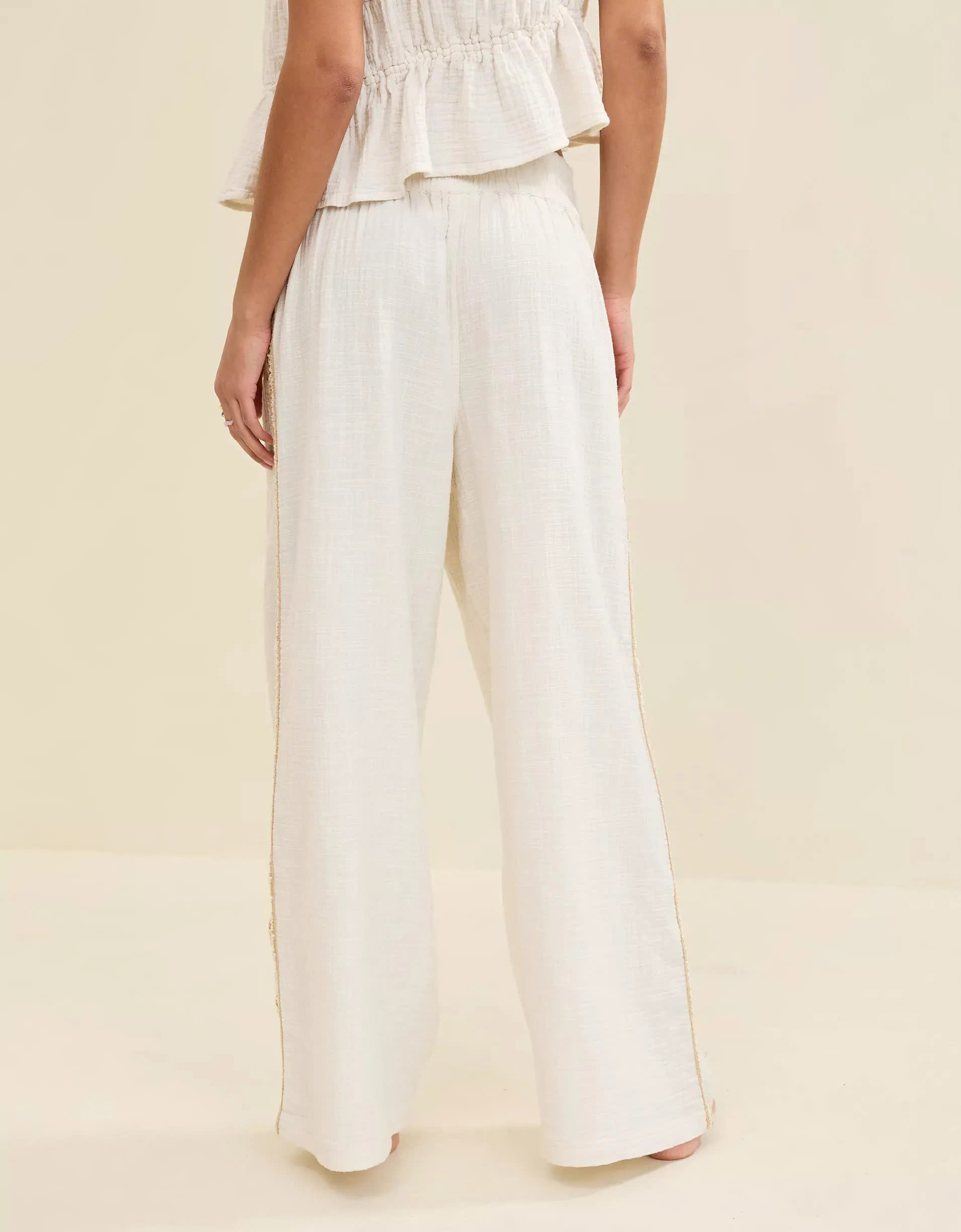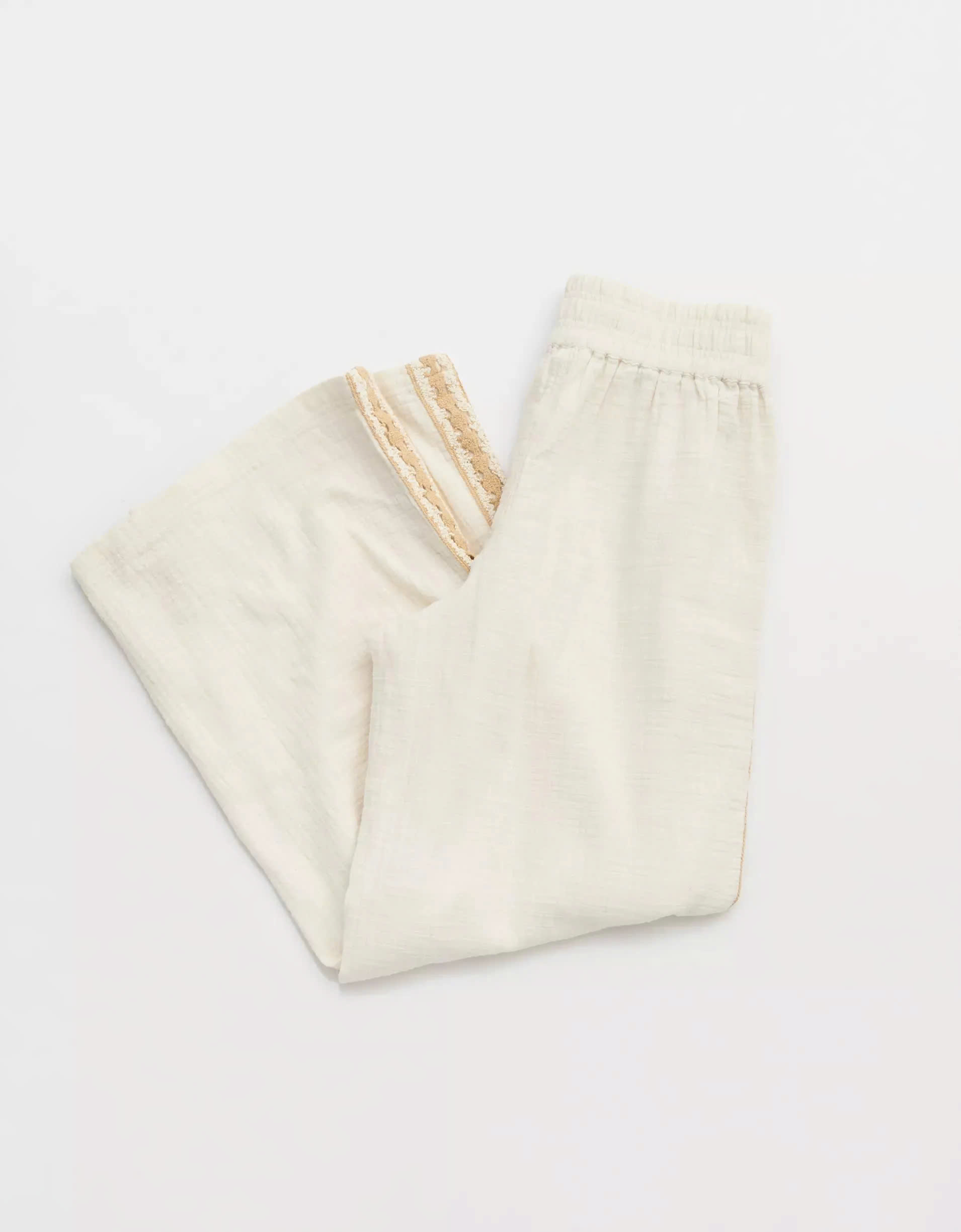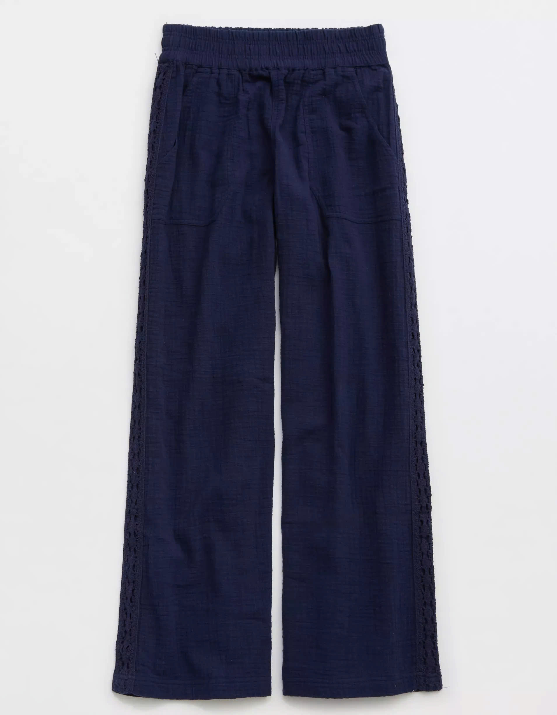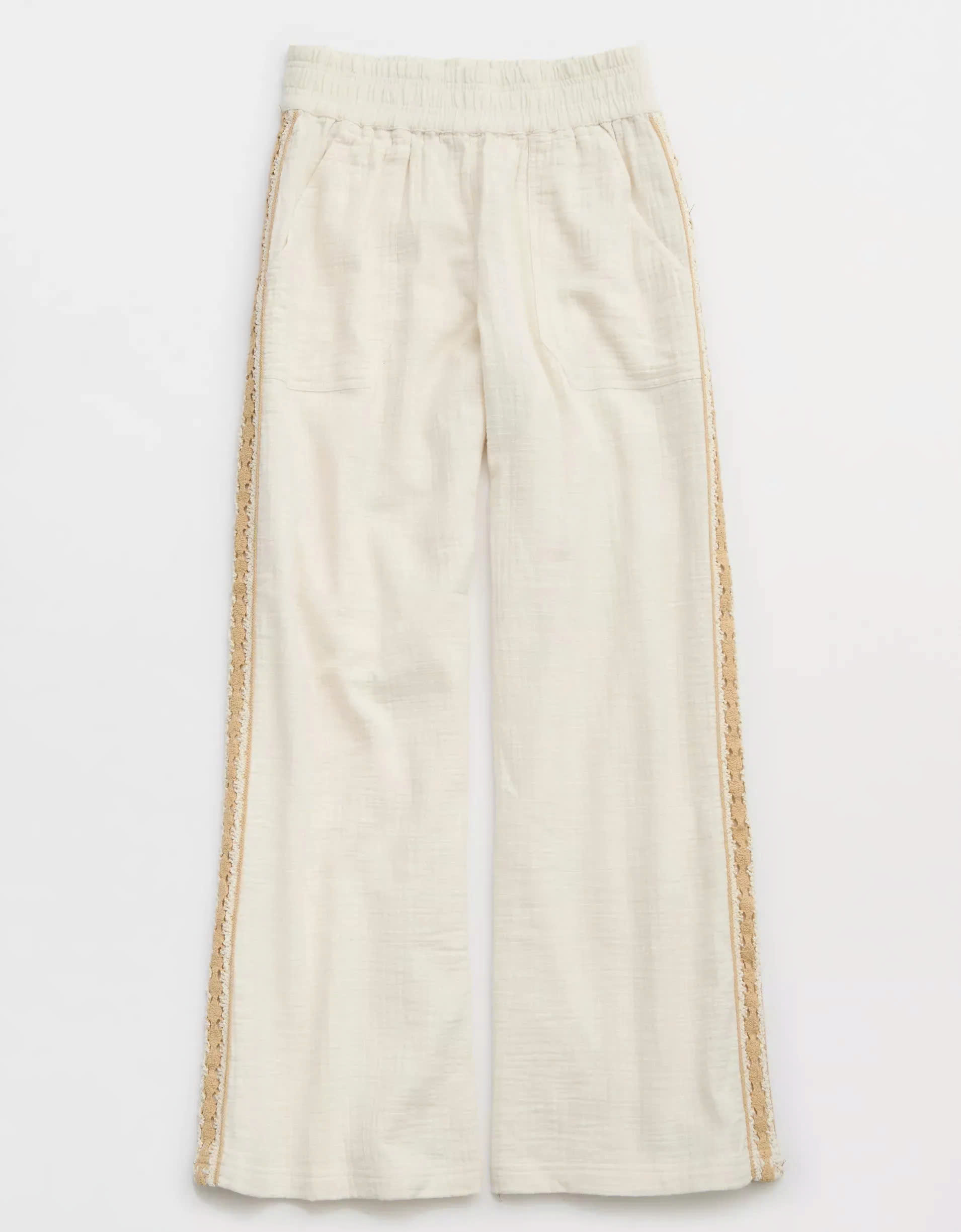 Delicate crochet accents along the sides add a touch of texture and artisanal charm, elevating the overall look and making these trousers stand out from the ordinary.