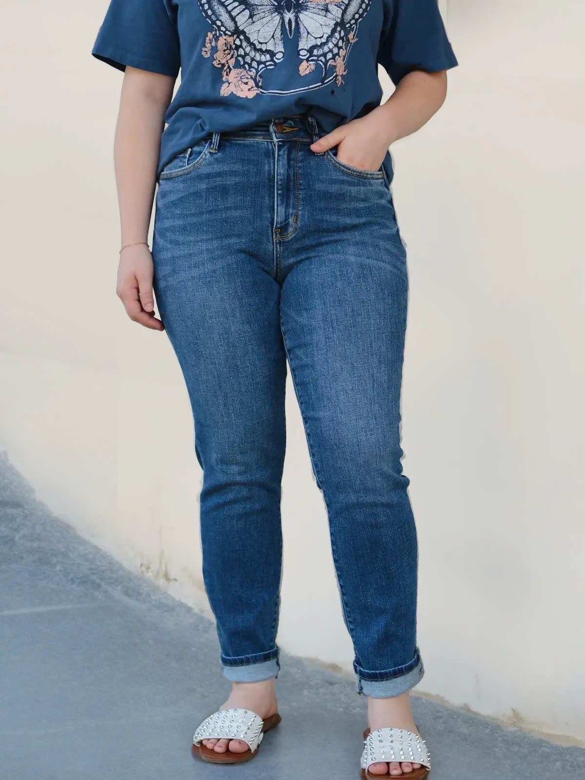 These jeans are the holy grail of denim and the epitome of trendy meets comfort! These have a relaxed fit! That is one of our favorite cuts here because it flatters ALL figures, is one of the trendiest styles, and is so comfortable!