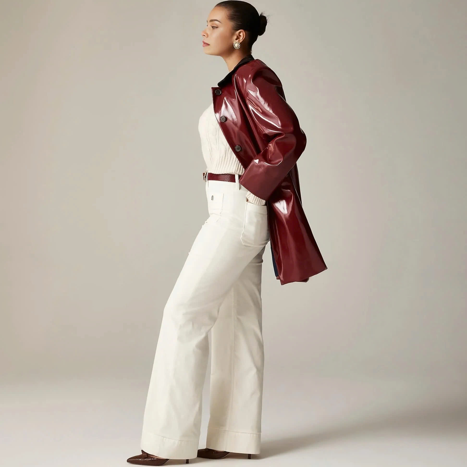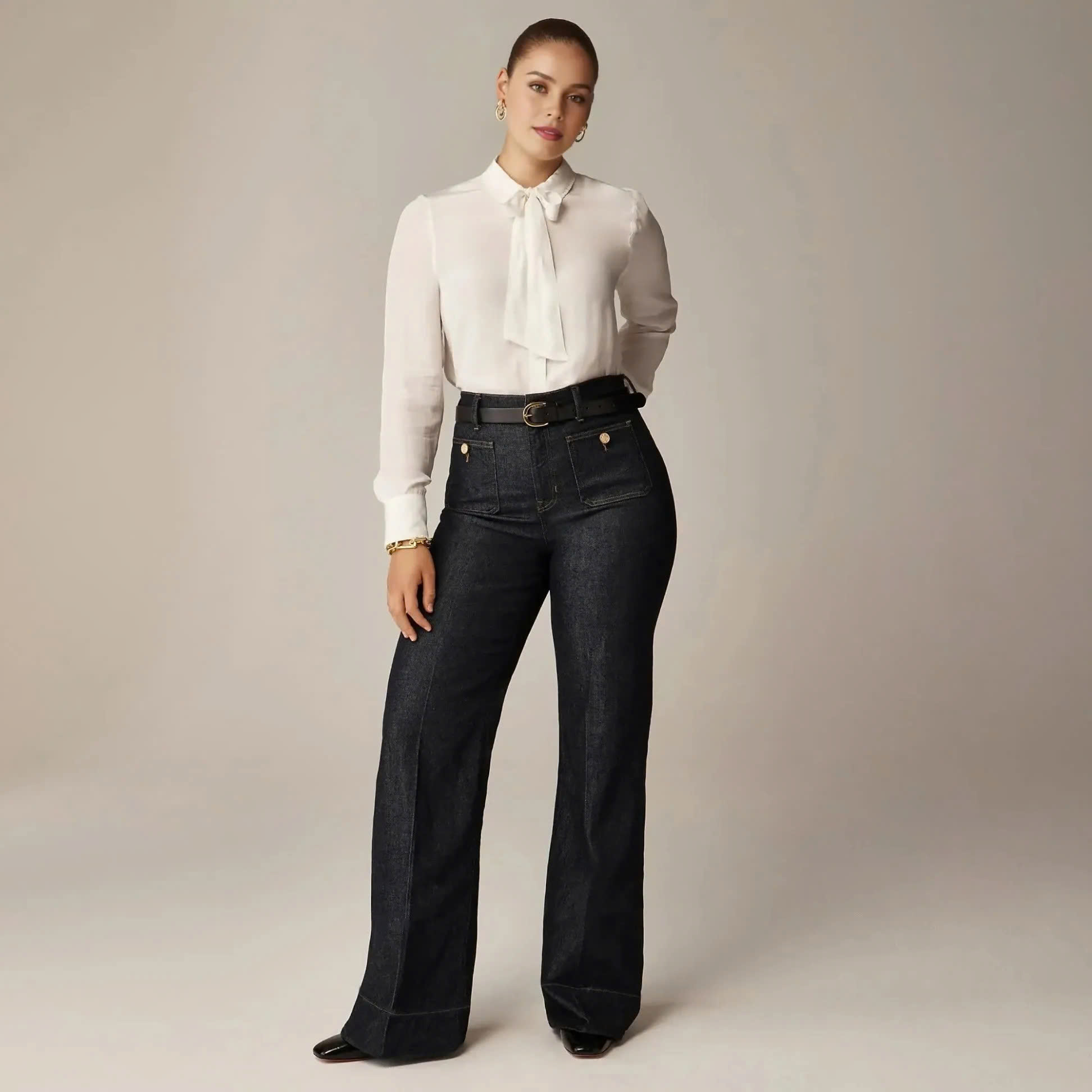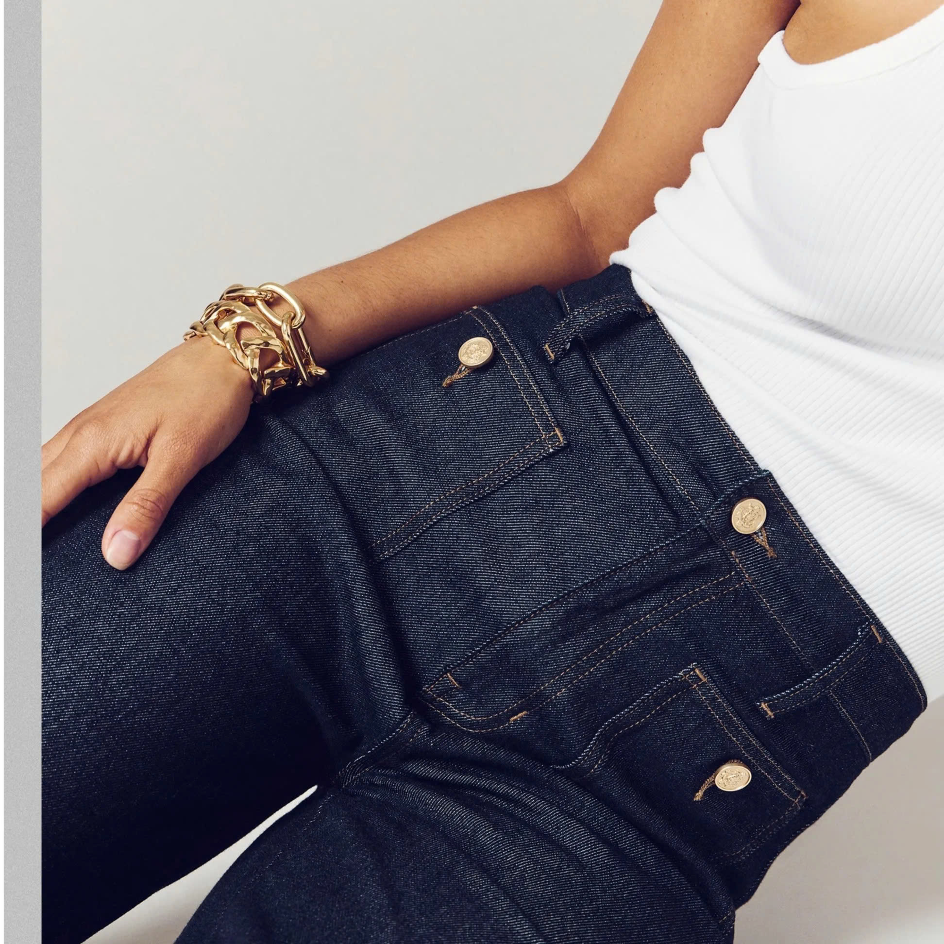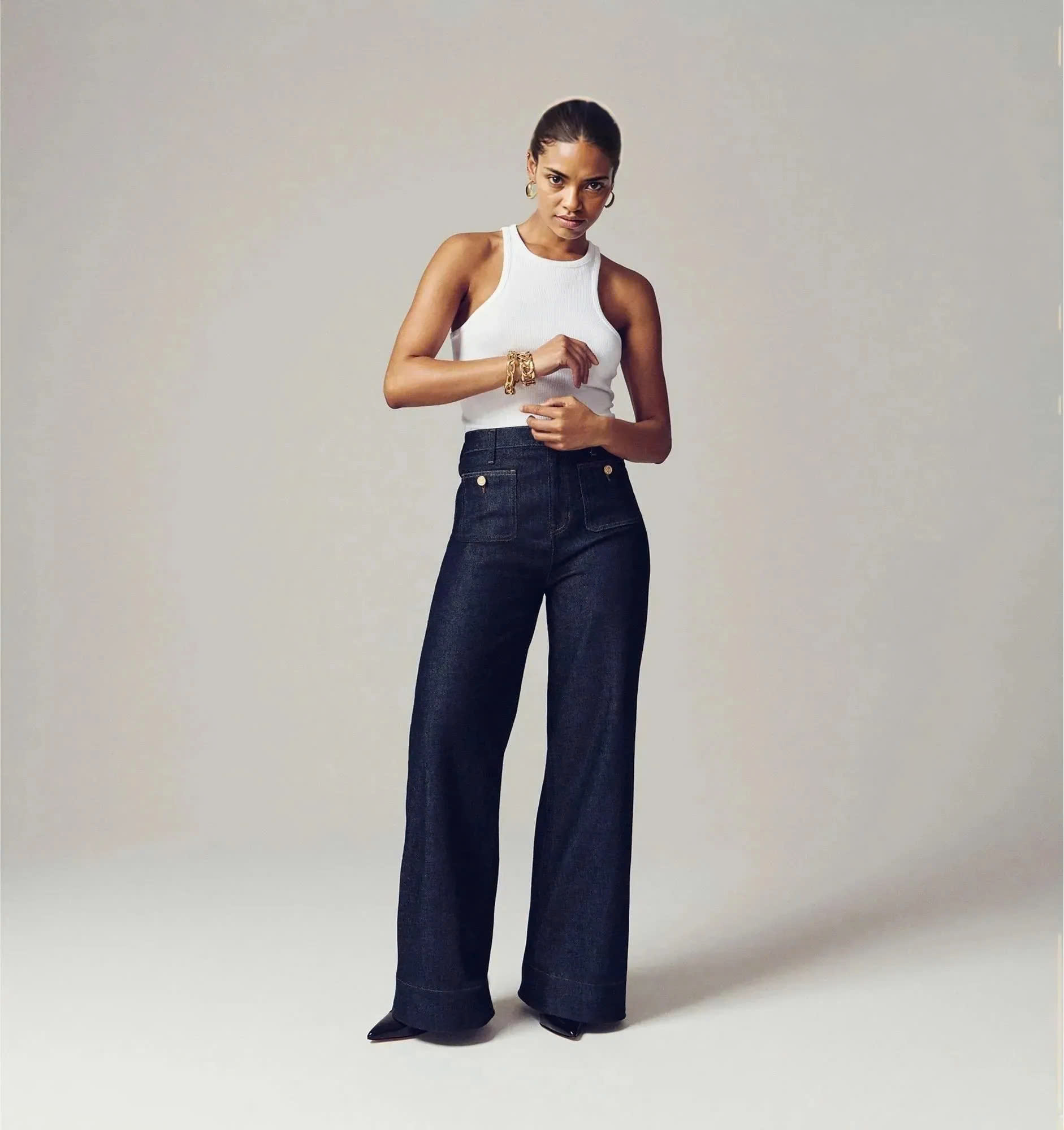 Our best-selling denim trousers, are refreshed with nautical details! This pair comes with a high rise and a full-length leg, plus patch pockets and our signature gold crest button details for added drama.
