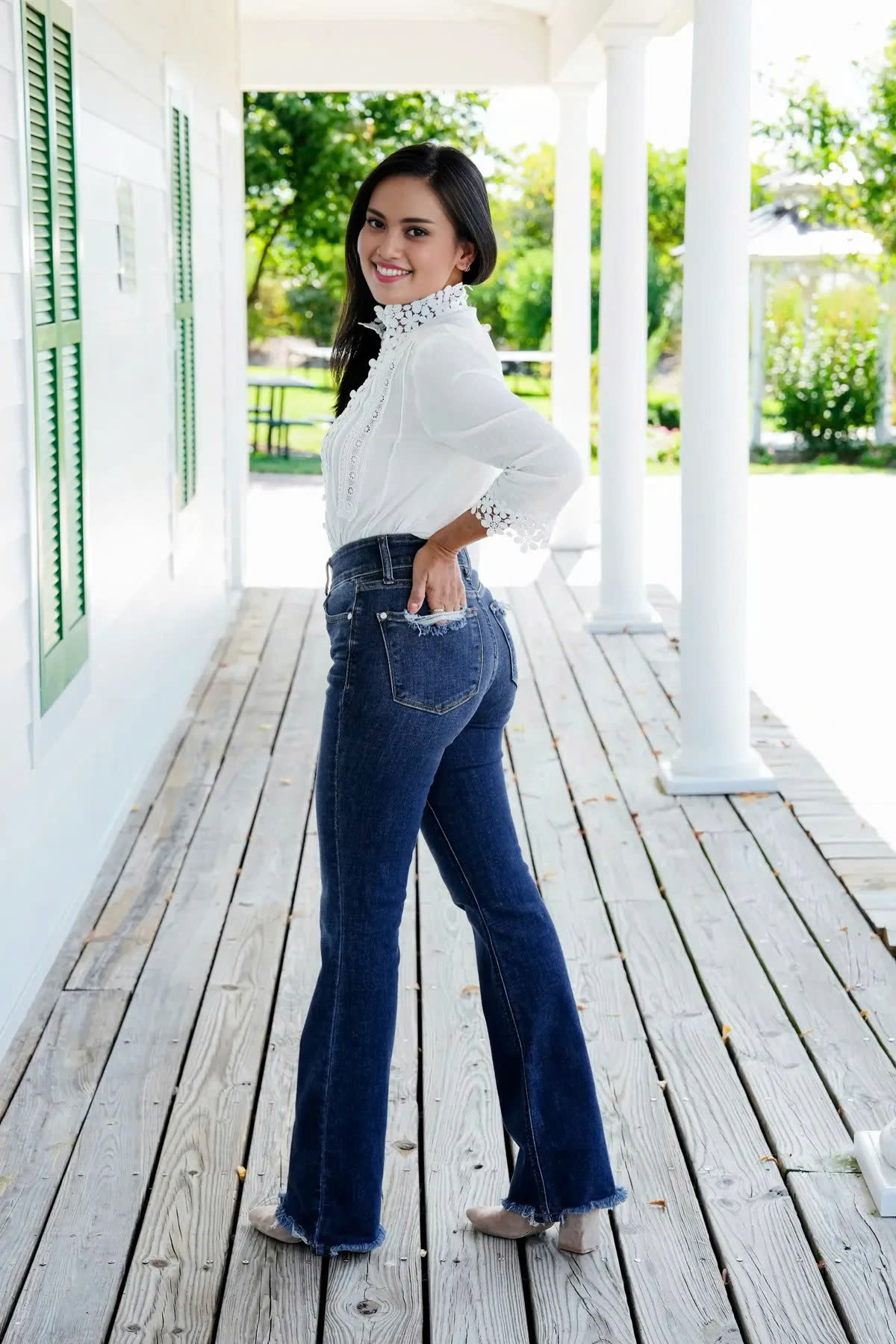 The frayed hem gives the jeans a vintage, lived-in appeal. This touch of ruggedness pairs perfectly with the sleek bootcut shape, balancing sophistication with casual edge.